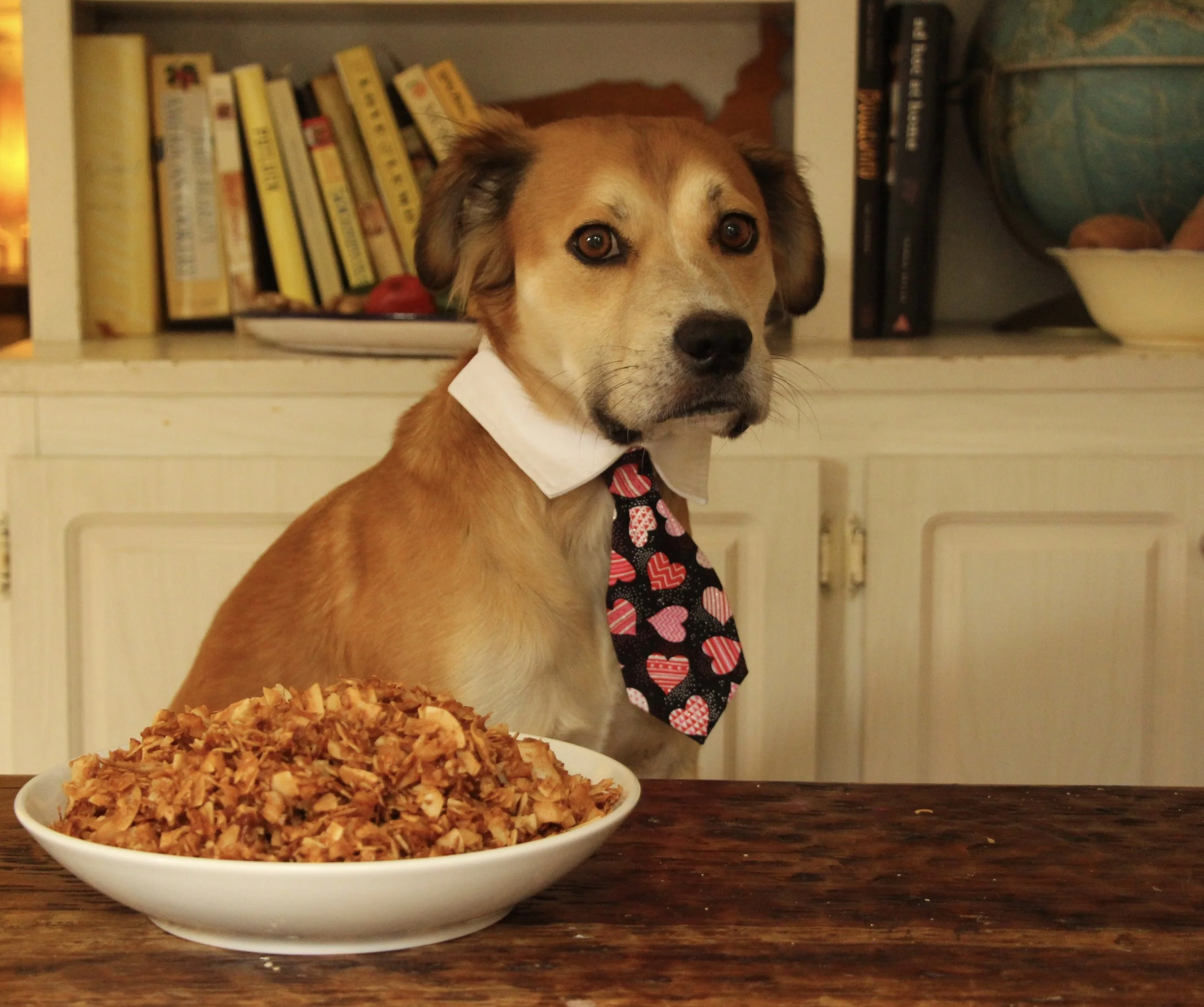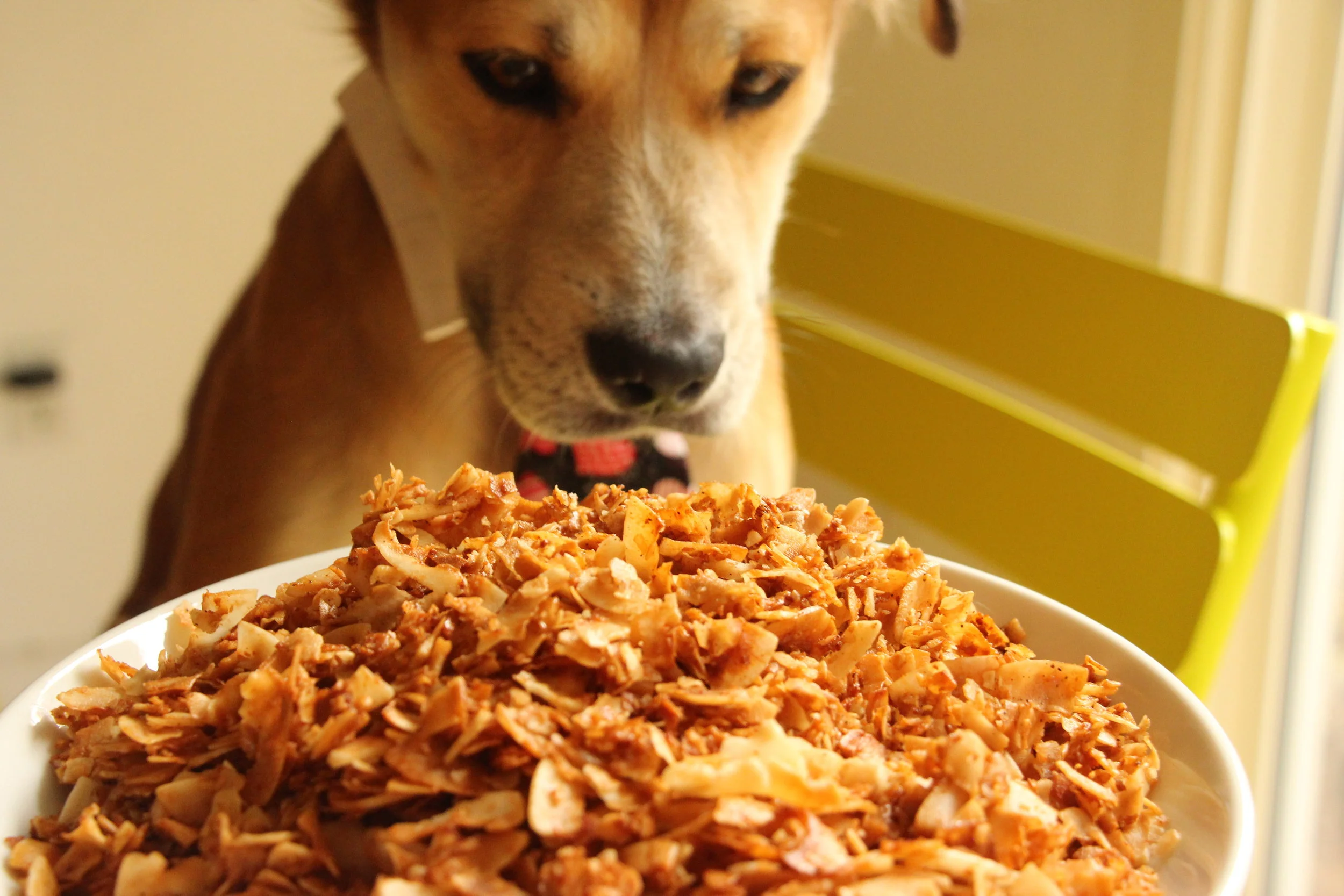 I have a feeling, dear reader, you are having a hard time deciding what to focus on in this picture. There is me, exhibiting impressive flair in my canine tie and blue steel face. Yet, there is also an absurdly large pile of COCONUT BACON. May this be the biggest dilemma you face all day. Though I am not usually one to divert attention away from myself, focus on the bacon. It’s all about bacon.